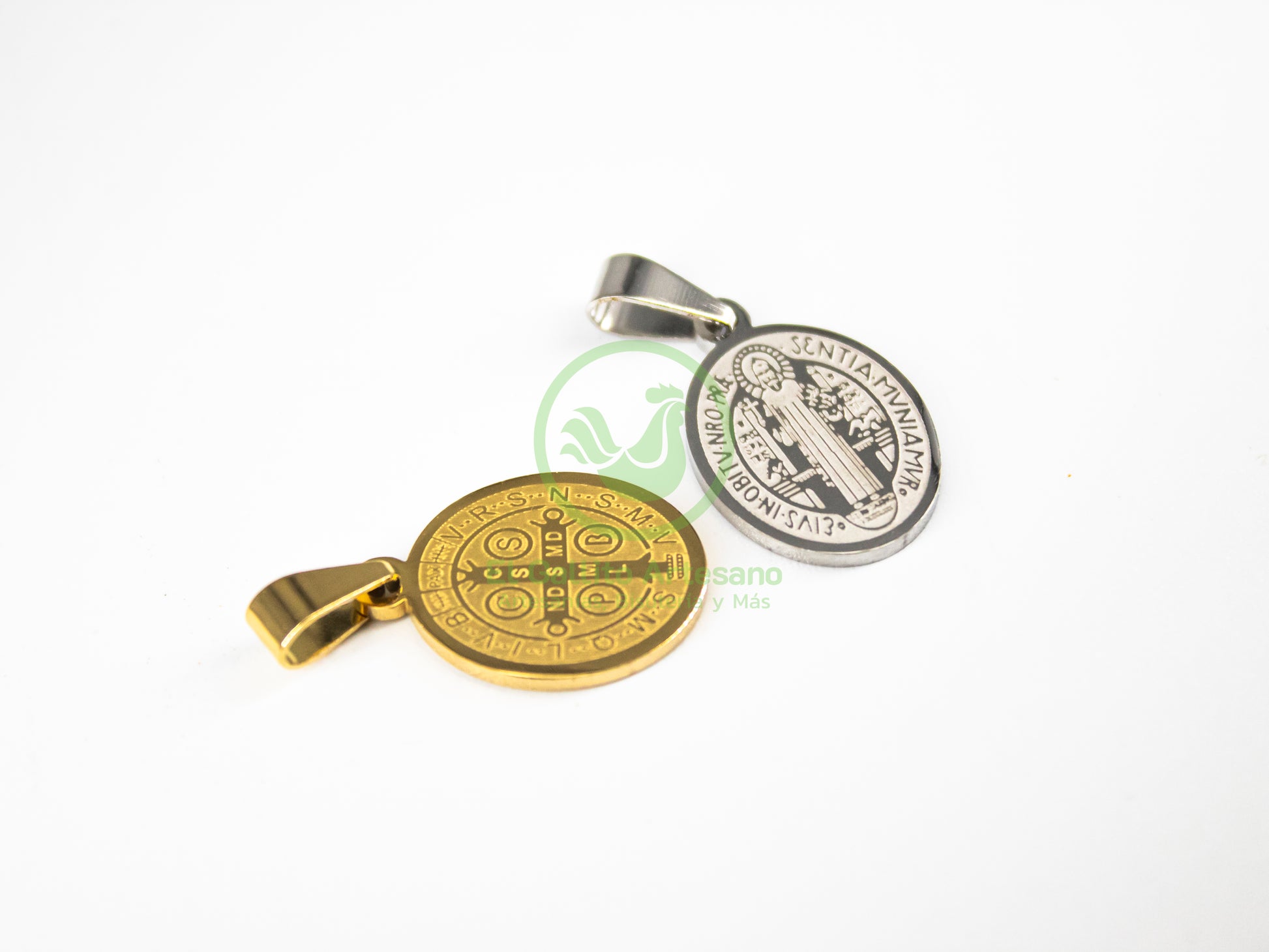 Dije de acero inoxidable en forma de círculo con imagen de San Benito con Cristales incrustados