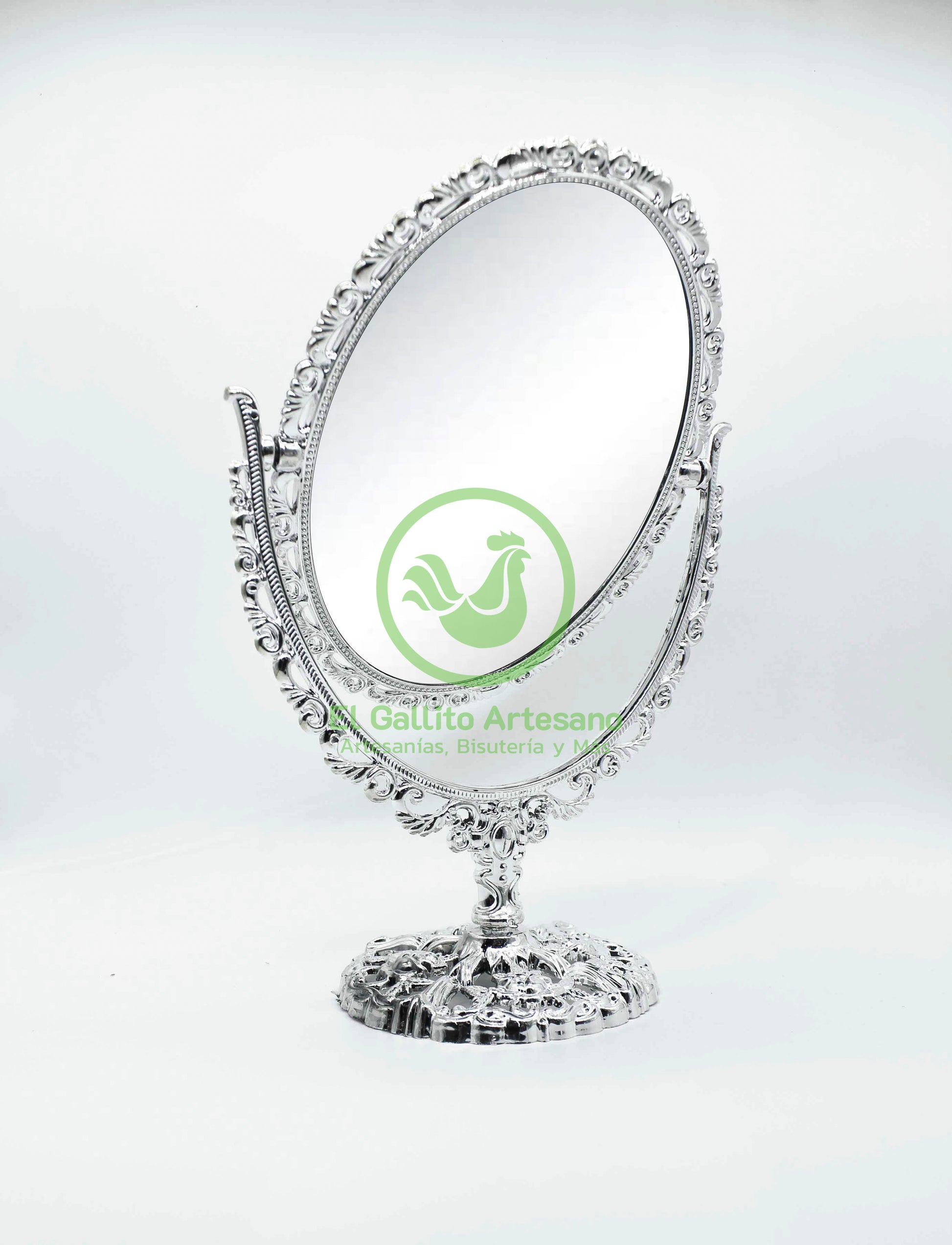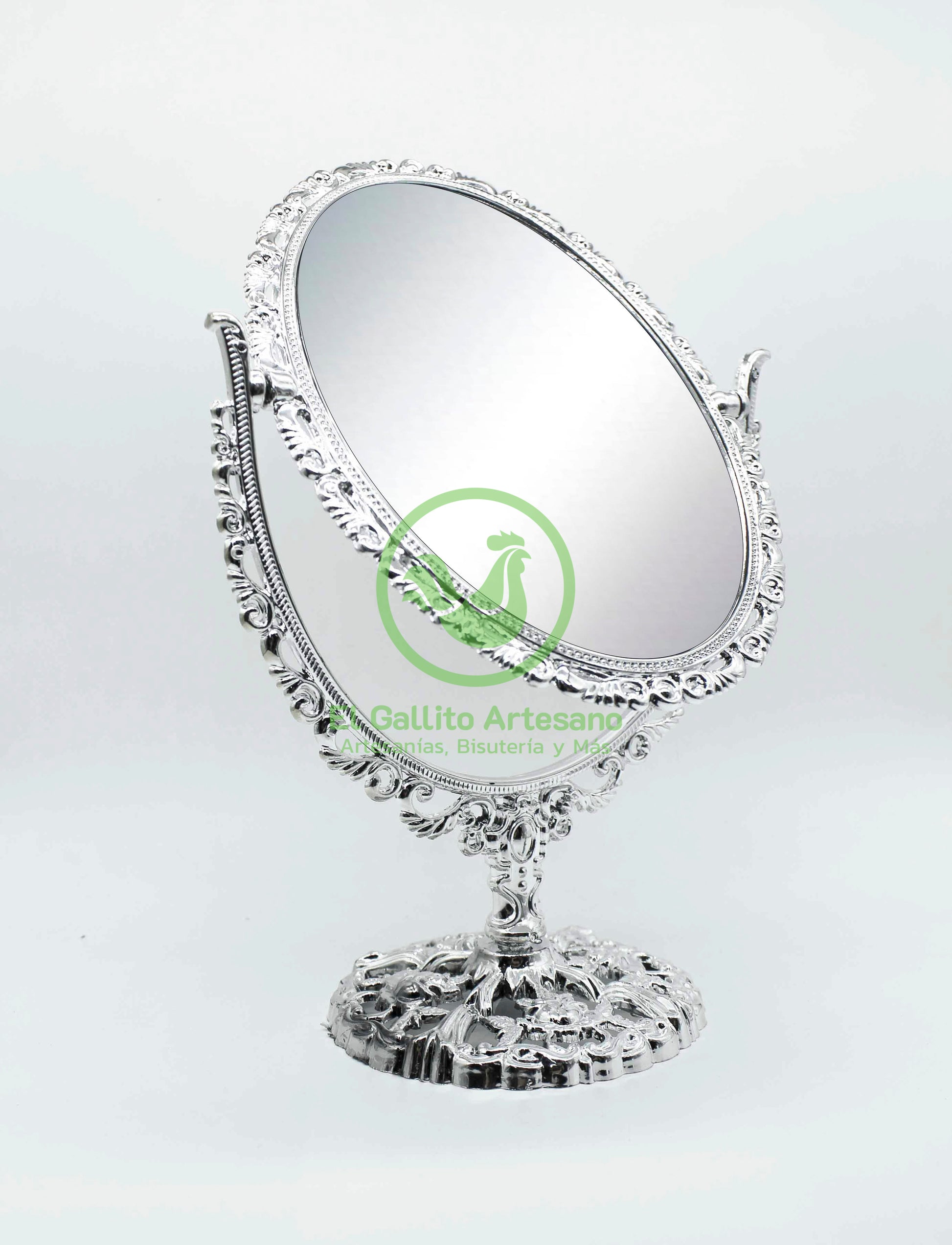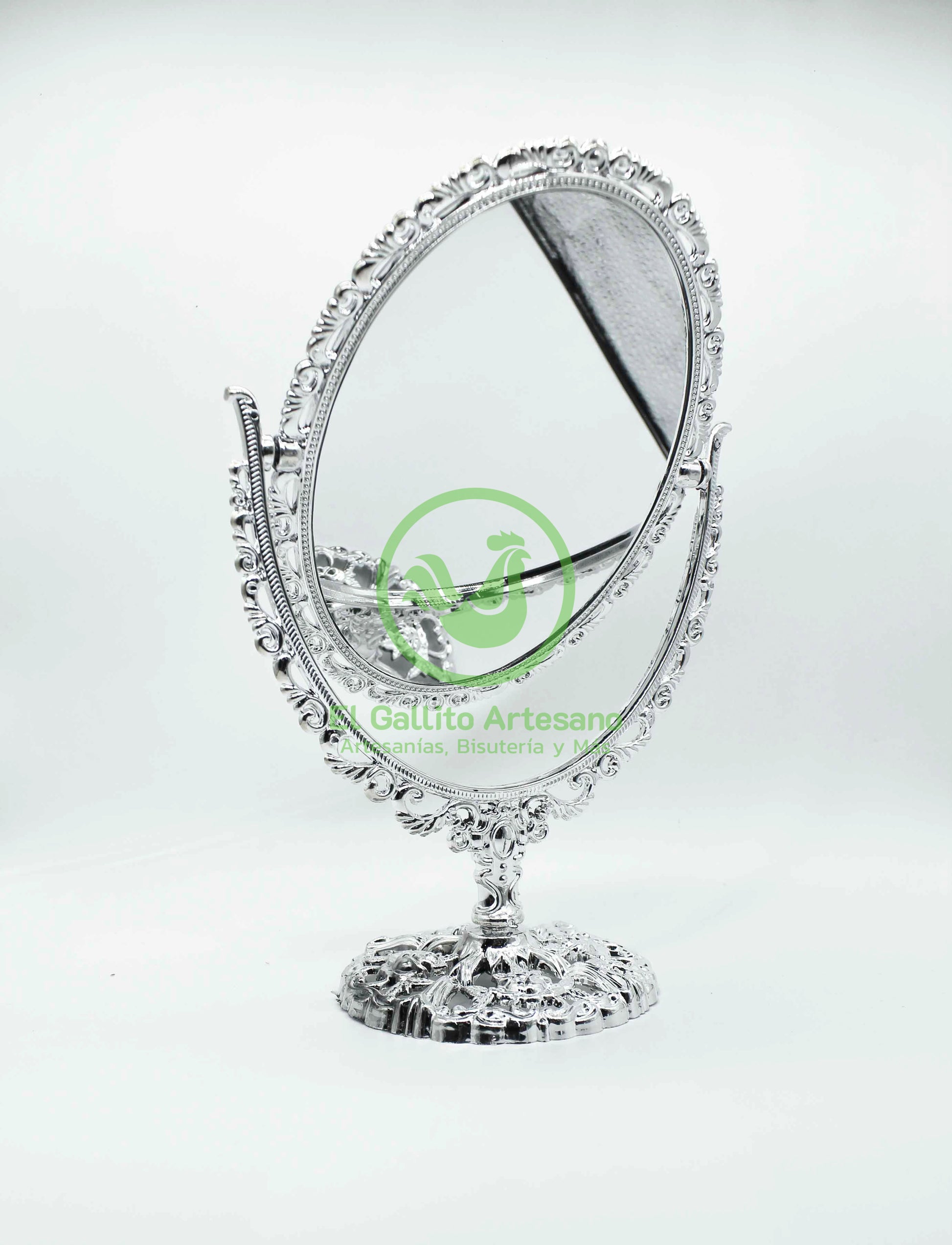 Espejo de 3 piezas con acabado vintage material acrílico/plástico con espejo de ambos lados, en forma de óvalo o circulo giratorio y base armable.