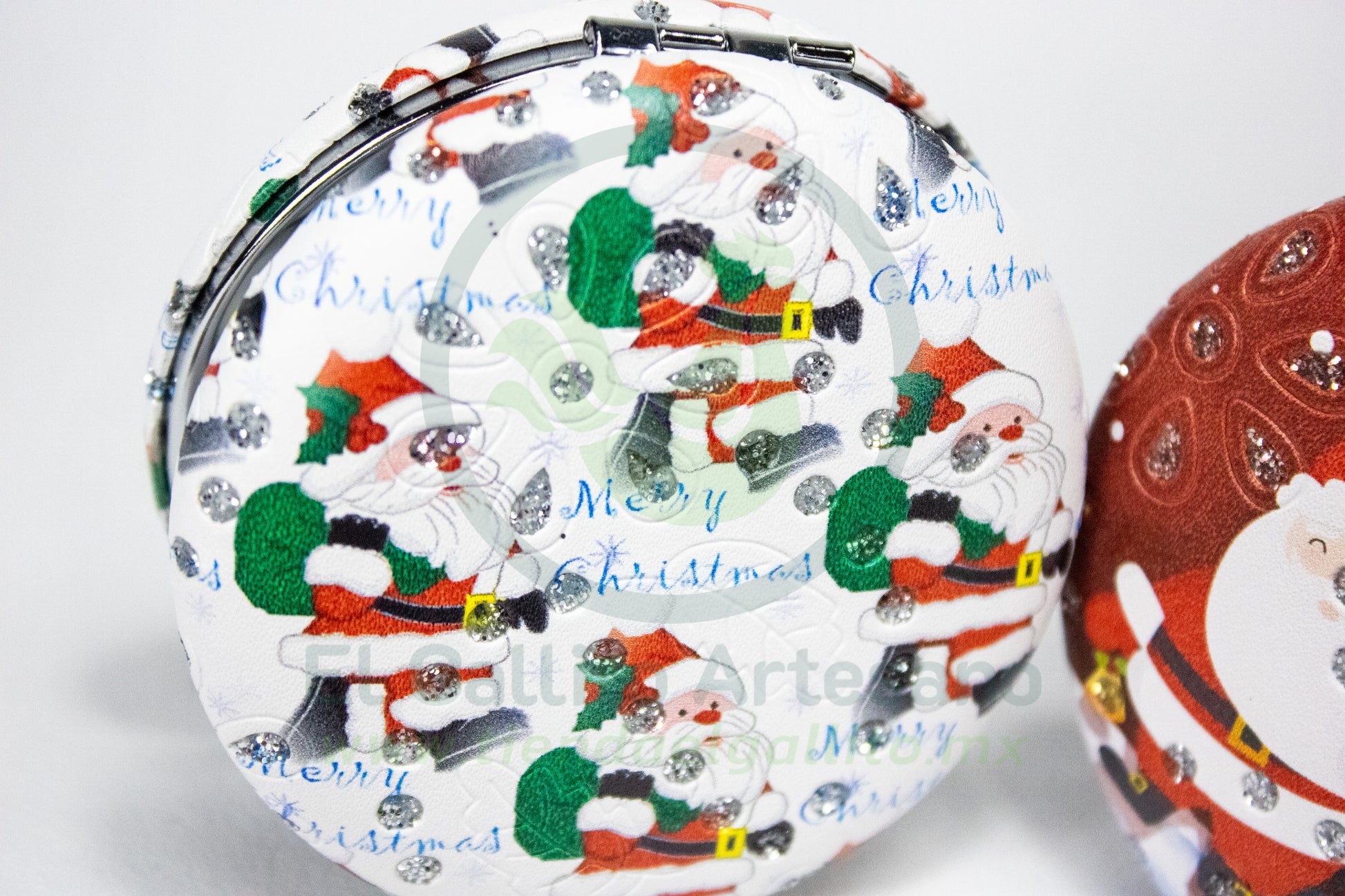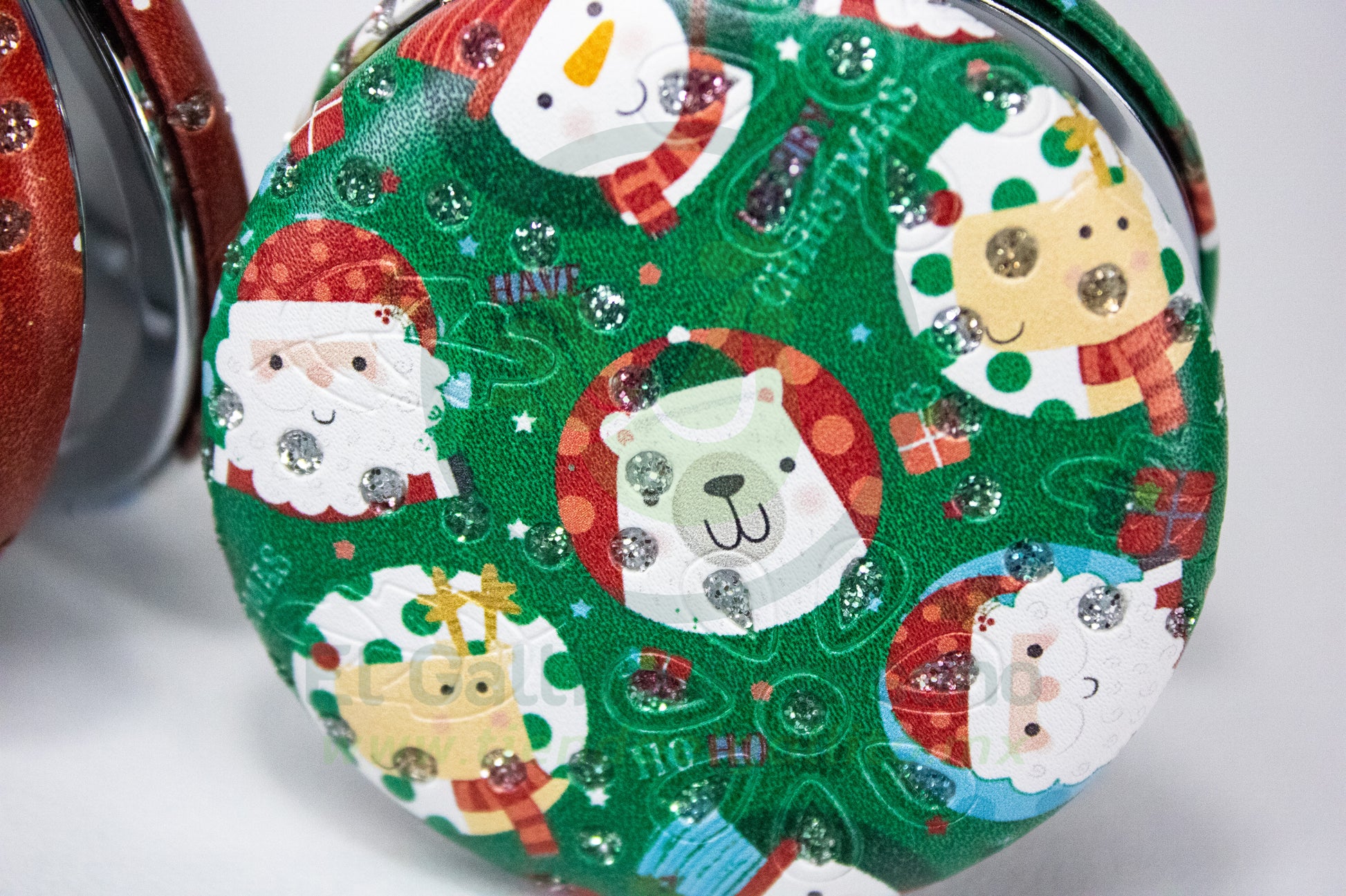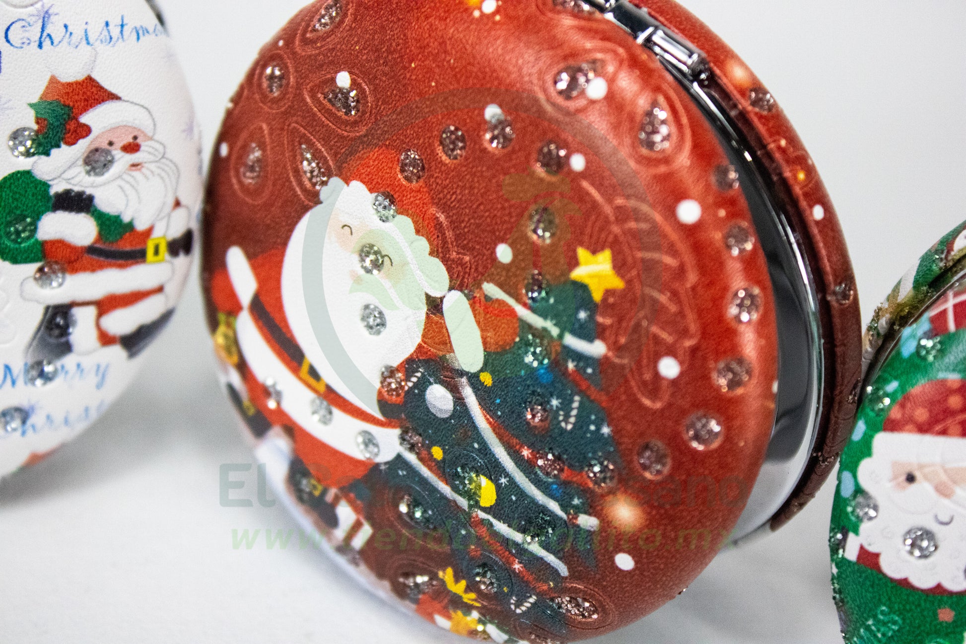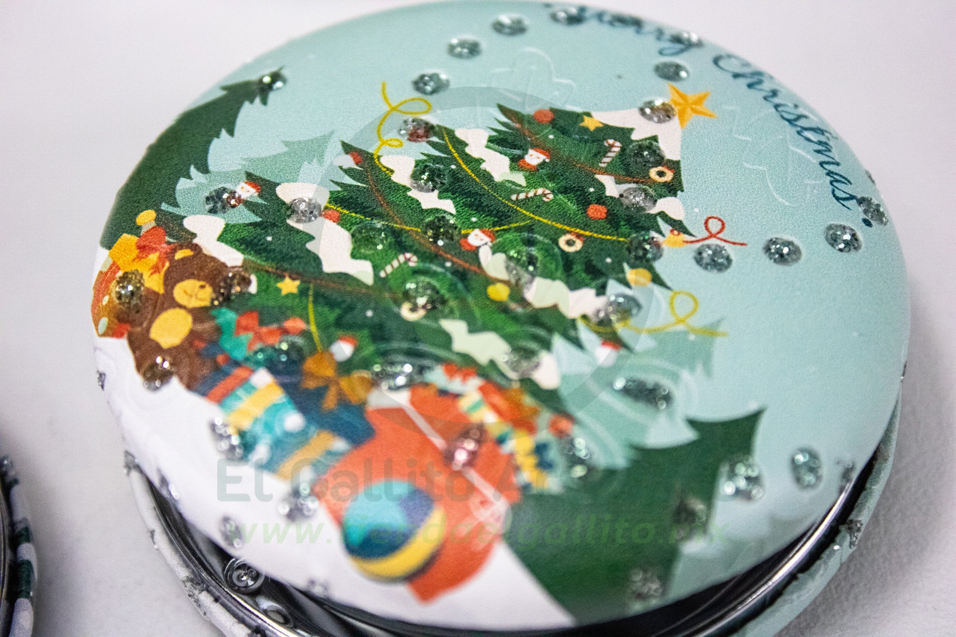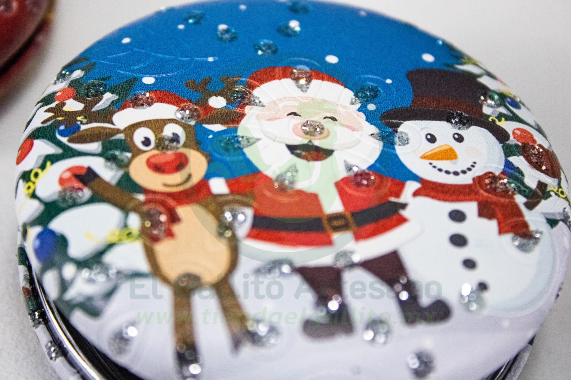 Espejo de bolsillo navideño con estructura metálica y piel sintética premium.