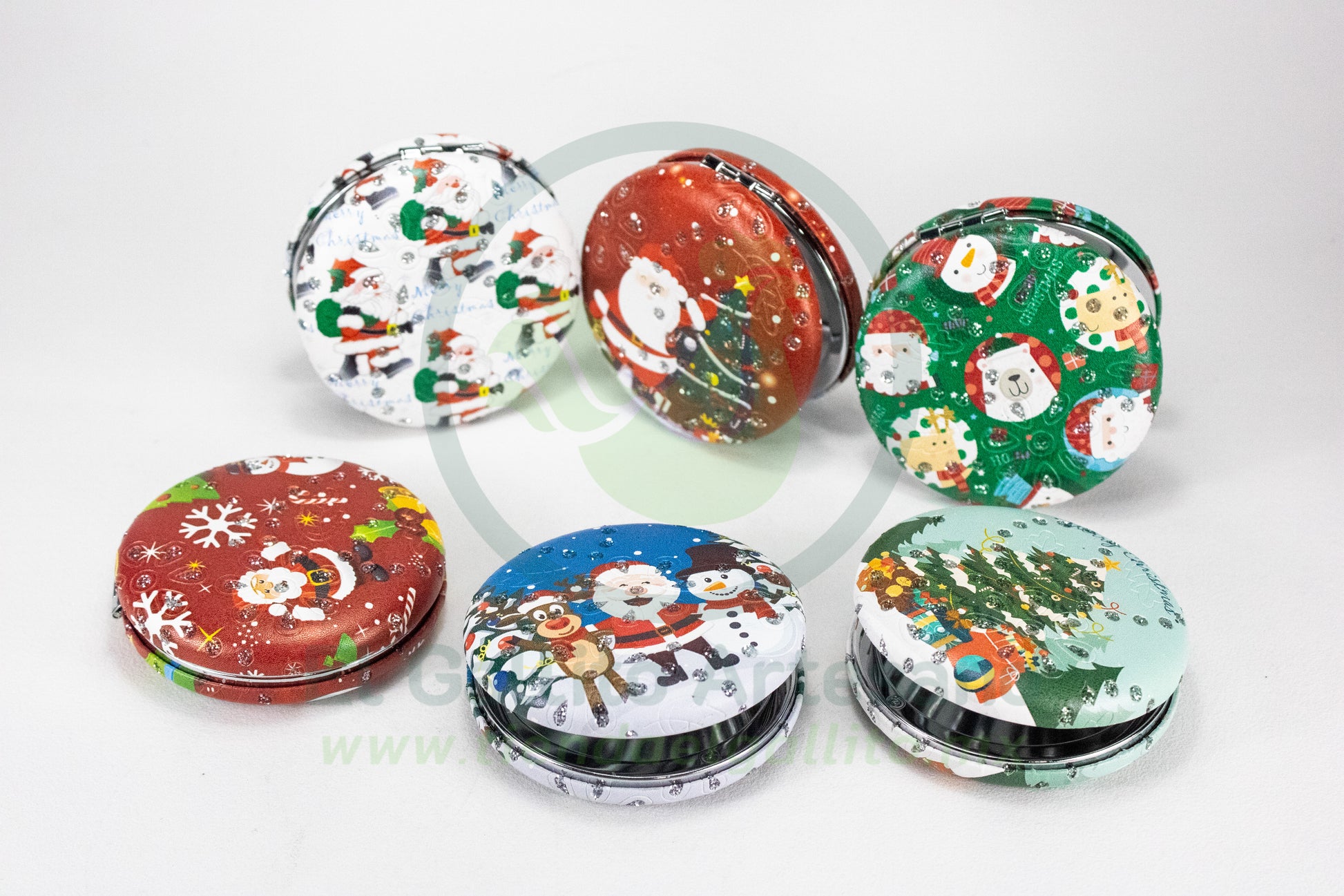 Tamaño compacto 7.1 x 7.1 cm, perfecto para llevar en tu bolso o bolsillo. Incluye 4 unidades con diseños variados. Ideal para retoques de maquillaje en cualquier momento y un regalo navideño excepcional.