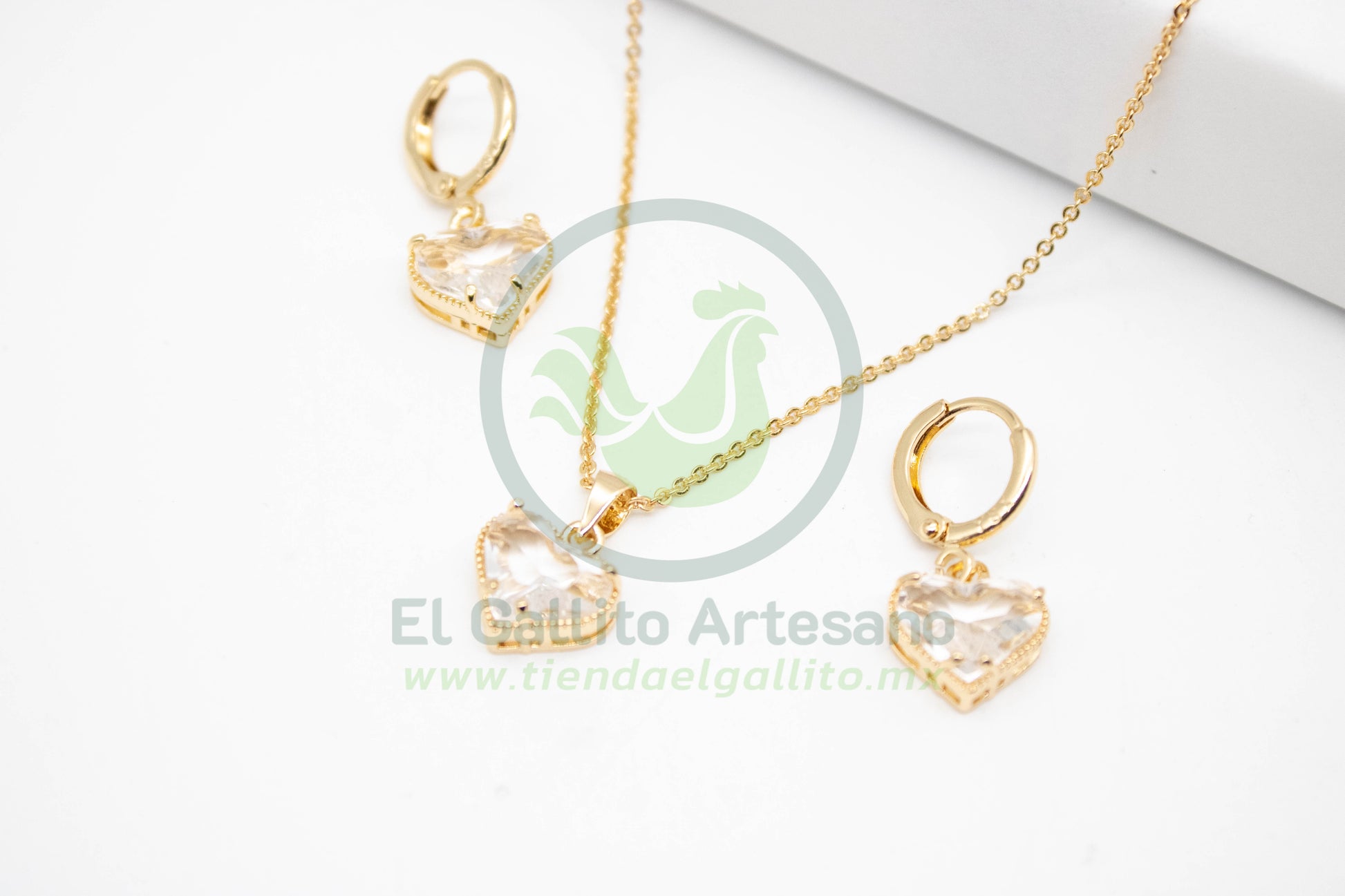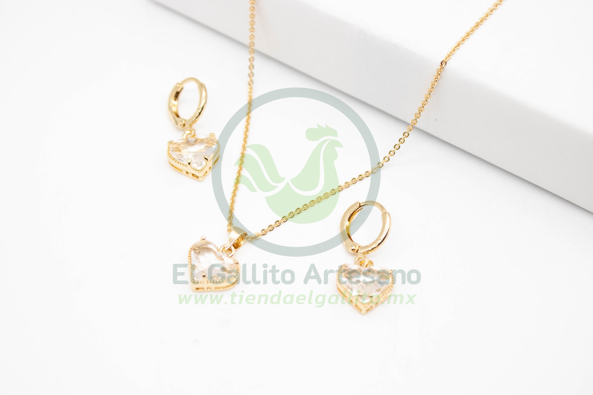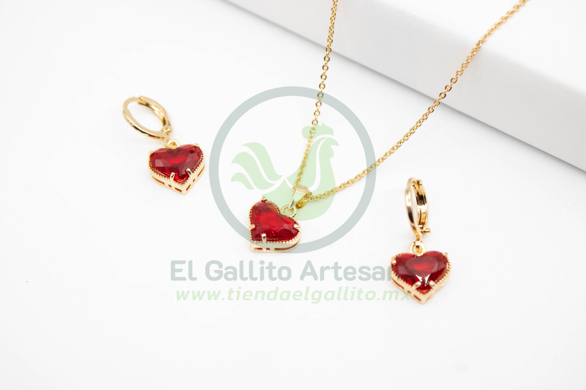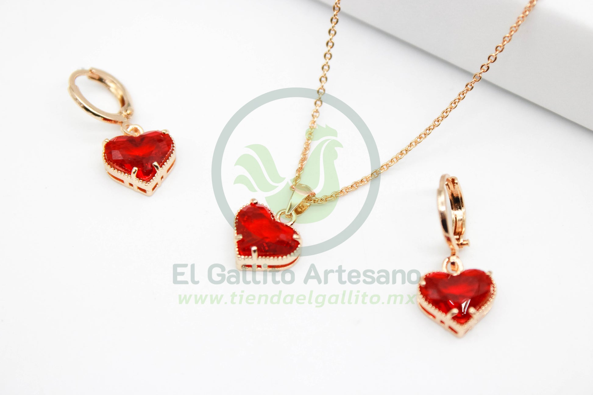 Conjunto de collar y aretes tipo huggie con dije de corazón y aretes en forma de corazón, con acabado dorado y cristales en tono rojo intenso. El collar incluye una cadena fina y elegante, mientras que los aretes cuentan con broche tipo argolla para mayor seguridad. Ideal para regalar o complementar un look romántico y llamativo.