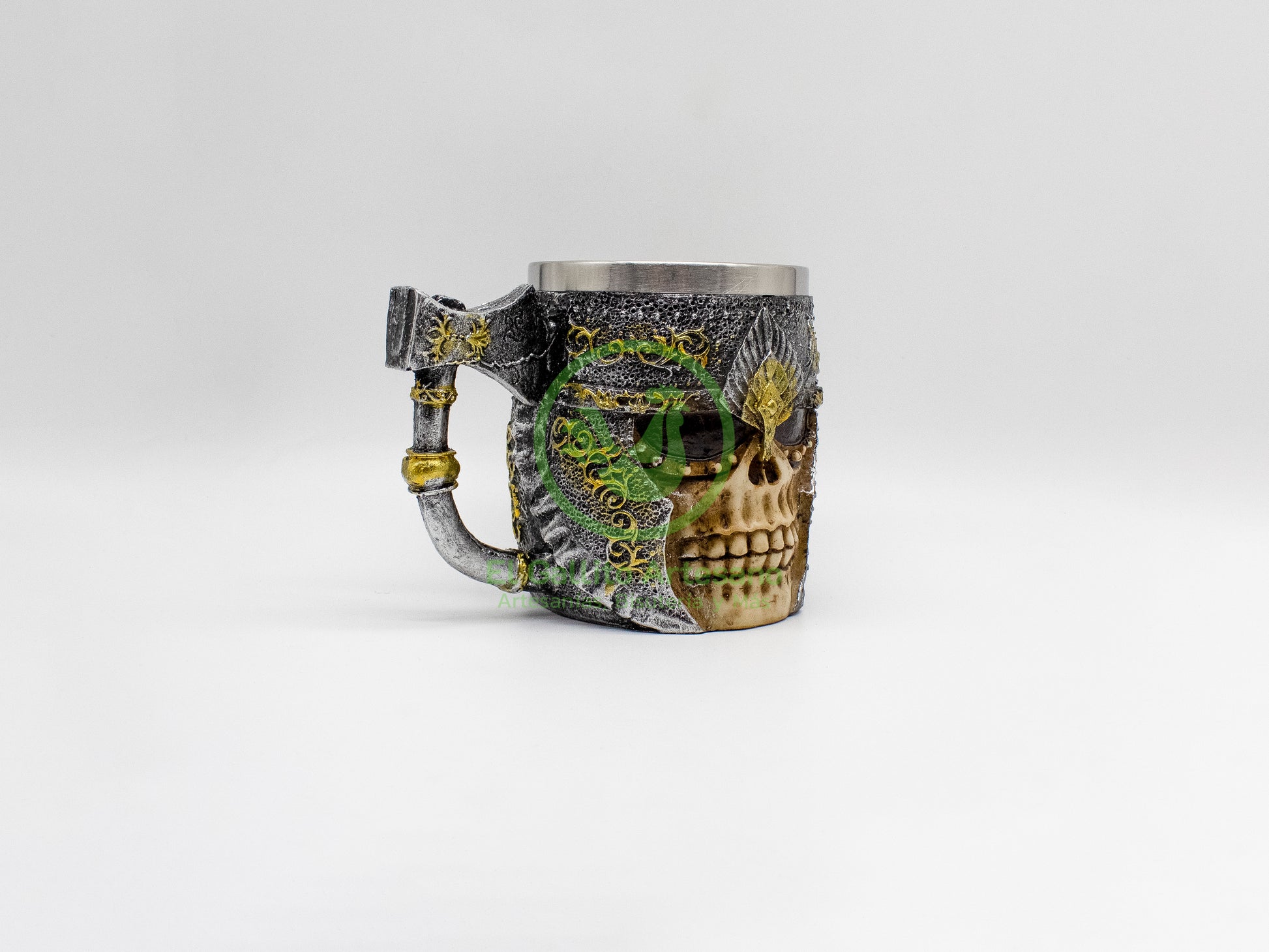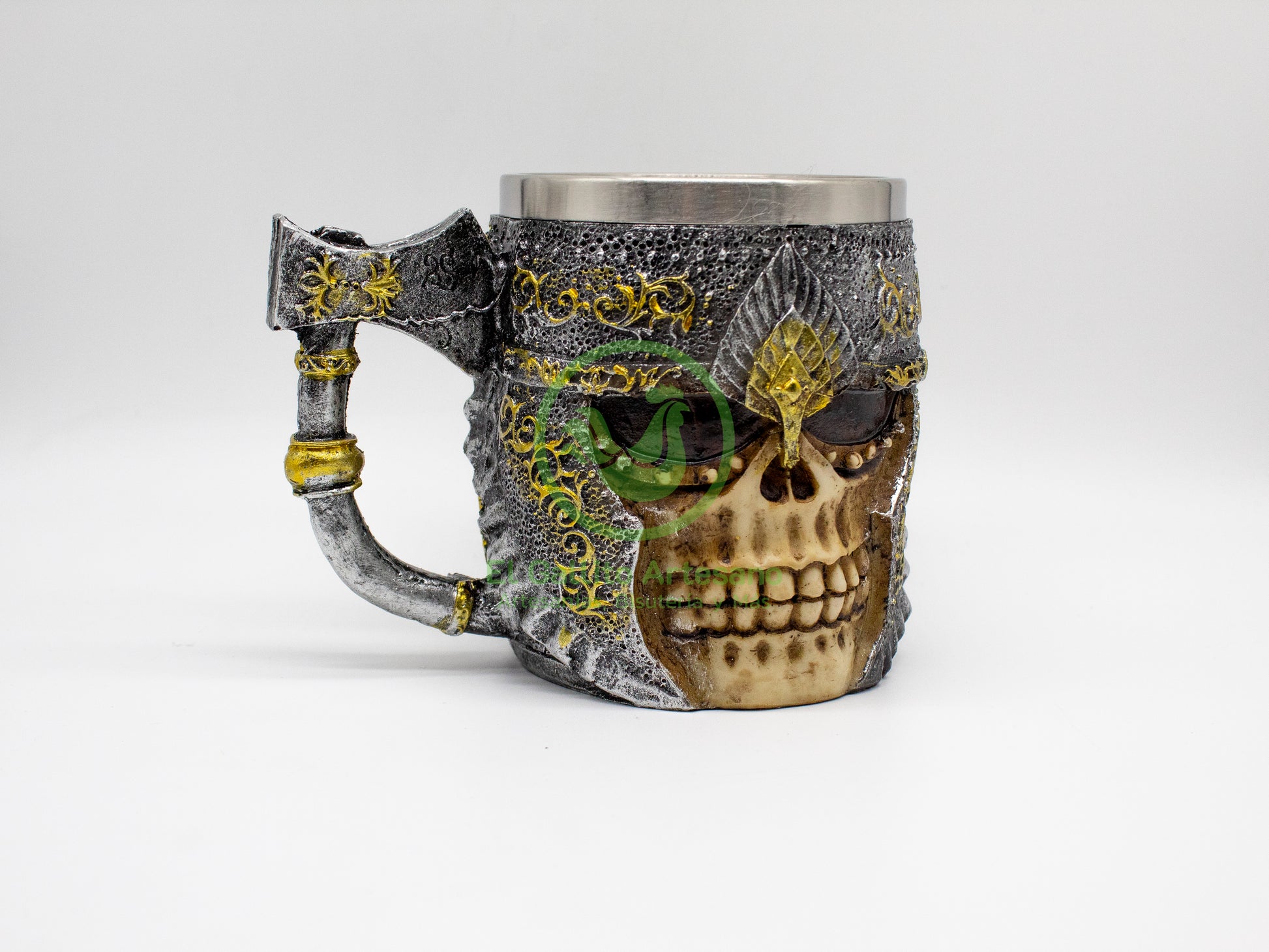 Taza exótica, de acero inoxidable de grado alimenticio, modelado con diseños únicos y exóticos con resina que harán tu cocina más interesante y atractivo. Diseño de Cráneo con aza de huesos de calavera. Acabado desgastado para mayor realismo. Color: Hueso desgastado. Medidas: 8cm diámetro x 11-12cm Alto.