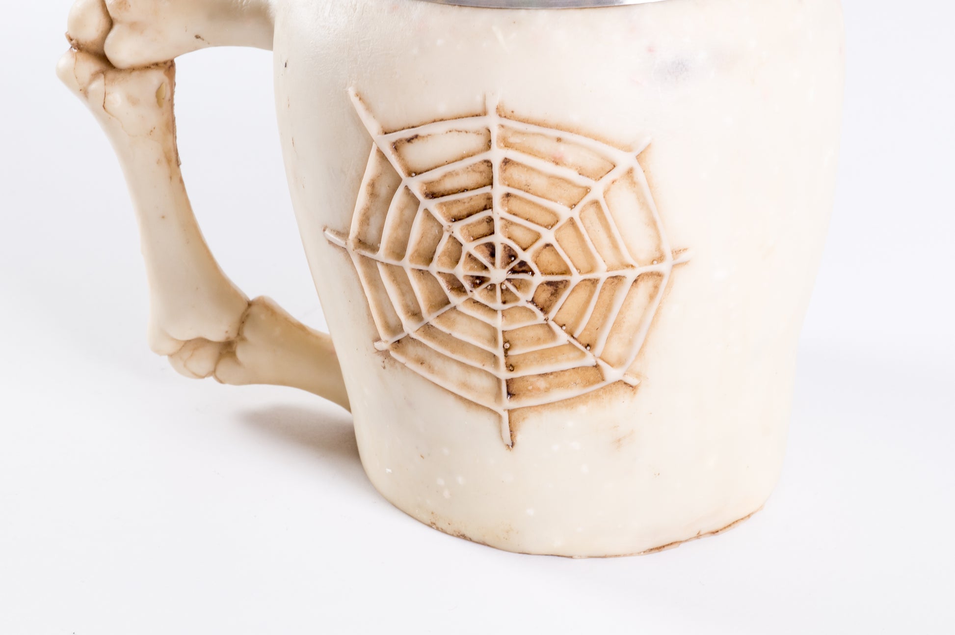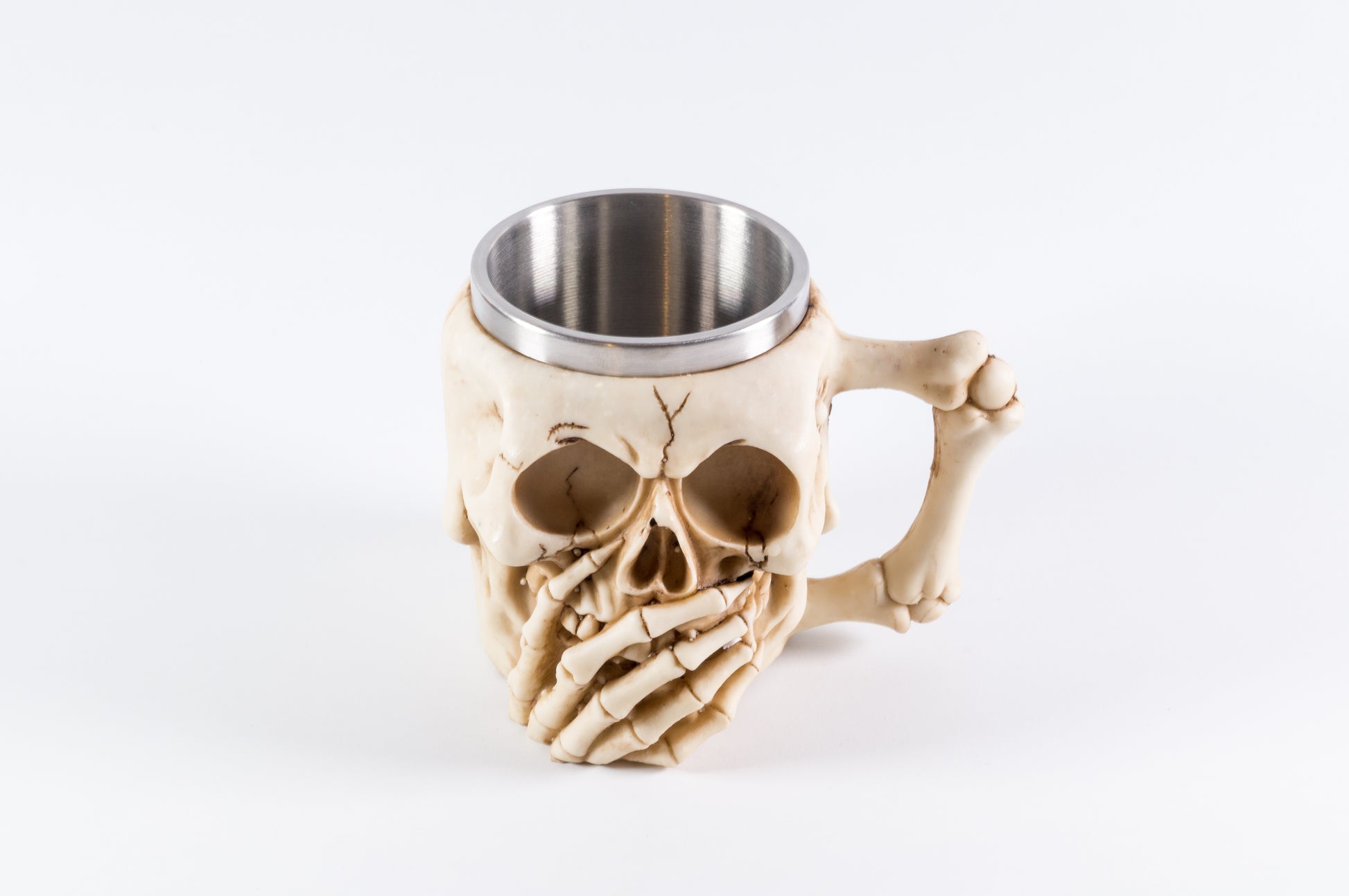 Taza exótica, de acero inoxidable de grado alimenticio, modelado con diseños únicos y exóticos con resina que harán tu cocina más interesante y atractivo. Diseño de Cráneo "NO HABLO" con aza de huesos de calavera. Acabado desgastado para mayor realismo. Color: Hueso desgastado y gris Medidas Diámetro: 8cm Alto: 11-12cm