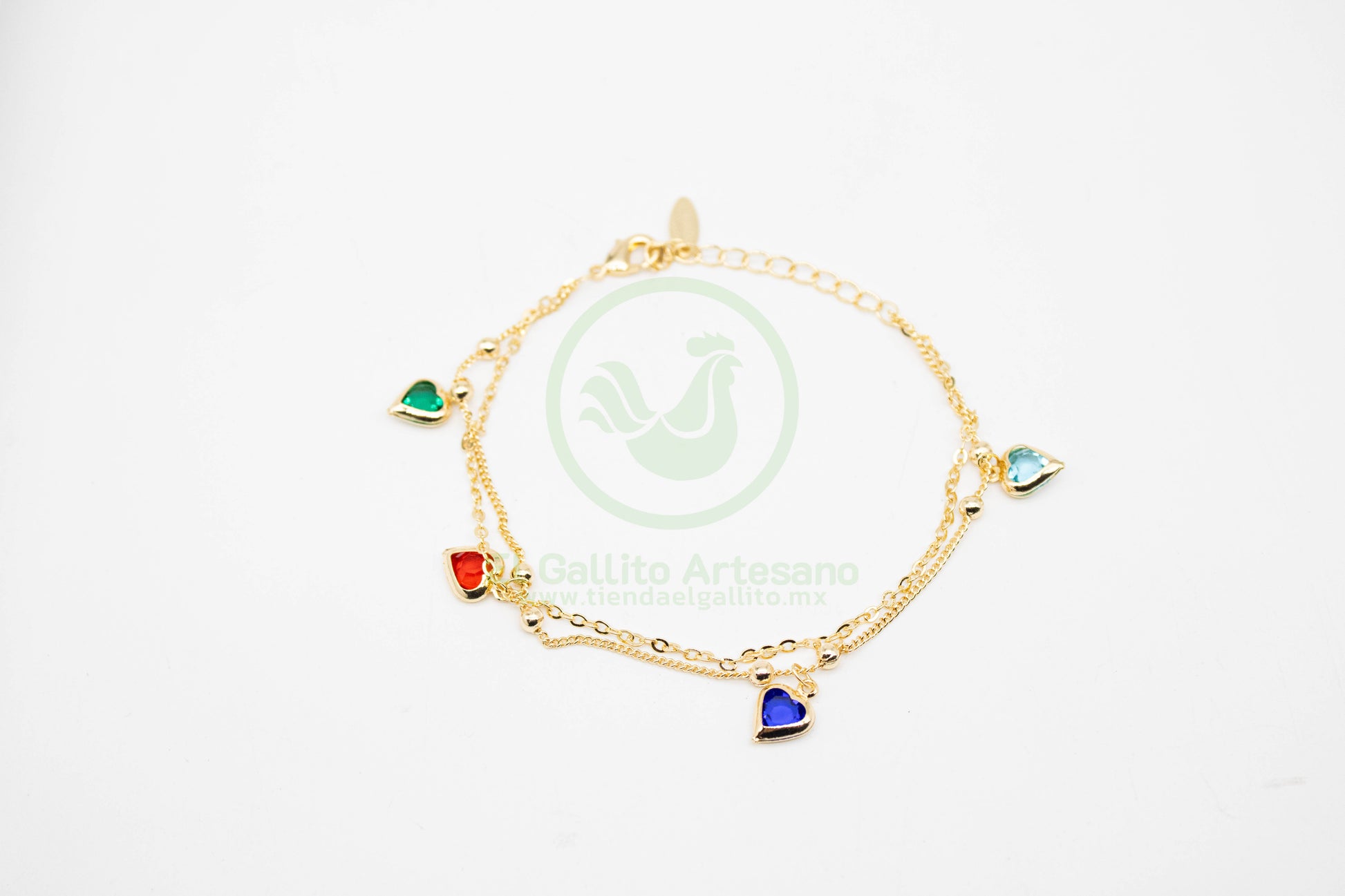 Sencillo pero elegante, este juego de dos pulseras en una sola, presenta una delicada cadena redonda y una atrevida cadena barbada con llamativos dijes multicolor de corazón transparentes con dorado, y bola separadora de 4mm